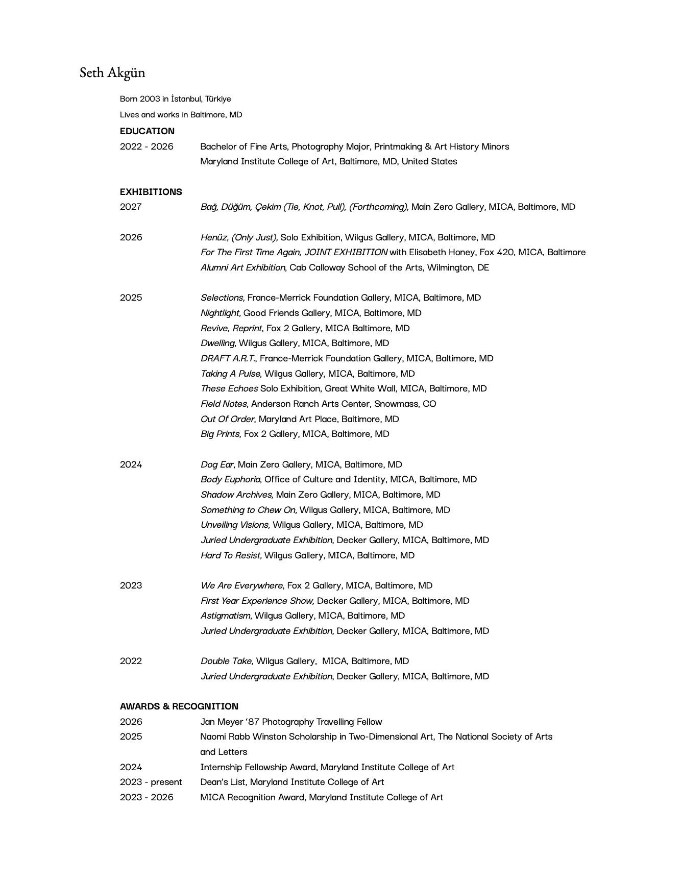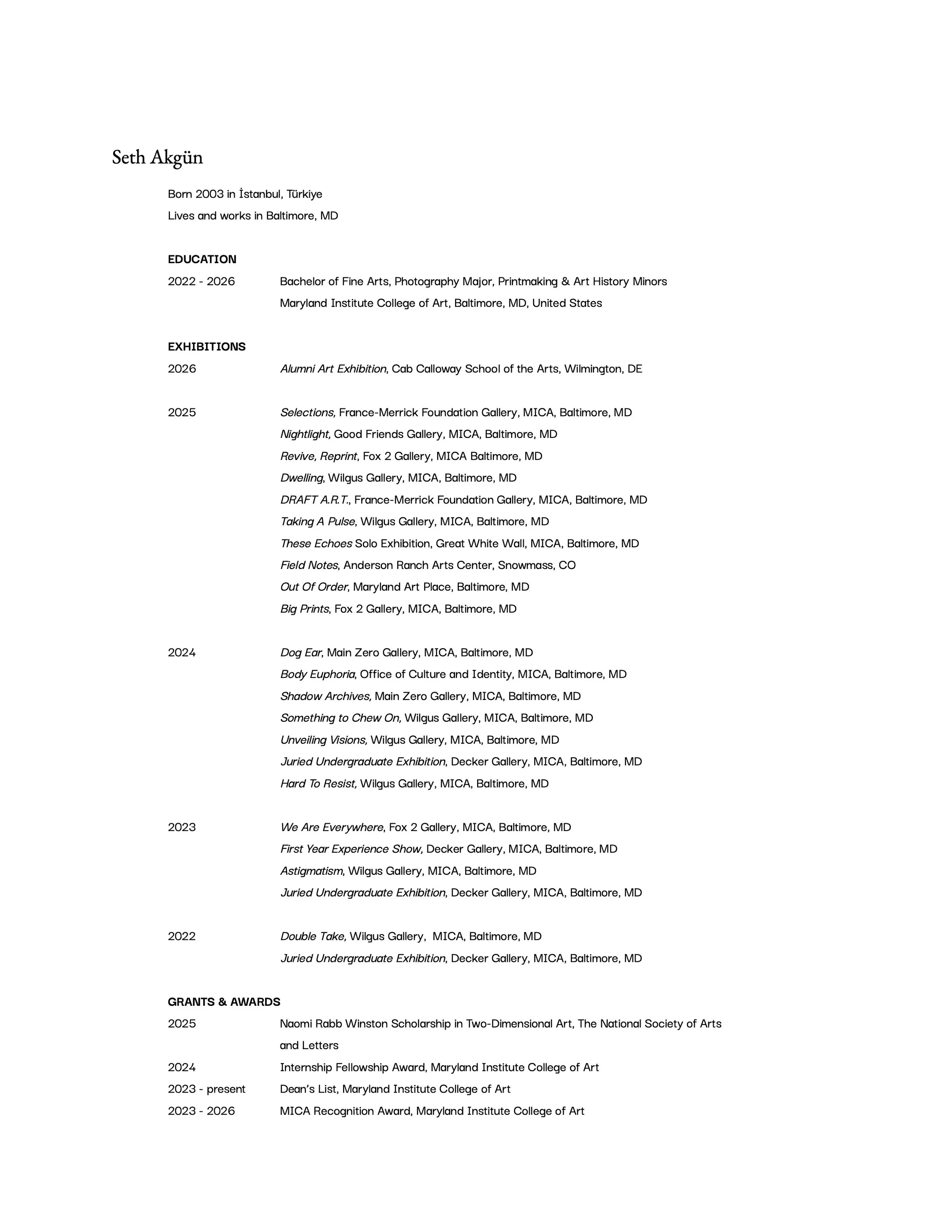 Seth Akgün is a photographer and printmaker currently working between Baltimore and İstanbul. His work is informed by his experiences as a queer person in a multicultural context amid the fluctuating definitions of home and family. Working with traditional practices in analog photography and printmaking, he engages with abstraction to portray the complexities of relationships between the body, surroundings, and the self. Akgün has had work shown in galleries at the Anderson Ranch Arts Center and the Maryland Institute College of Art including the Main Zero, Decker, Pinkard, and Wilgus Gallery for a variety of solo and group juried exhibitions and is a recipient of the 2025 Winston Art Scholarship. Akgün has worked in freelance photography and graphic design, has interned at Aperture in Finance & Accounting and Public Programming departments, and the Anderson Ranch Arts Center assisting photography workshops. Seth Akgün is currently a senior pursuing a BFA at the Maryland Institute College of Art.